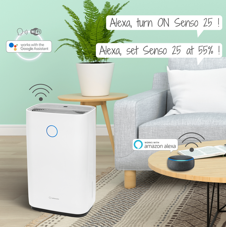 Desumidificador Turbionaire SENSO 25 WIFI com Wi-Fi e indicador LED de humidade O Turbionaire SENSO 25 WIFI regula de forma rápida e eficaz a humidade do ar, proporcionando um ambiente mais saudável em casa ou no escritório. Trata-se de um desumidificador por condensação compacto e silencioso, com capacidade para remover até 25 litros de água por dia, sendo ideal para divisões até 120 m². Este modelo moderno com ligação Wi-Fi pode ser controlado remotamente através da aplicação Smart Life, disponível na Google Play e na App Store. É também compatível com assistentes de voz como a Alexa (Amazon) e o Google Assistant. A regulação local pode ser feita diretamente através do painel digital intuitivo na parte superior do equipamento. Inclui ainda bloqueio de segurança para crianças, evitando alterações acidentais. Pode selecionar duas velocidades de ventilação e ajustar a humidade desejada entre 30% e 80%. Também pode ativar o modo AUTO, o modo Sleep (reduz a intensidade da luz para mais conforto) e a função de secagem de roupa. O aparelho funciona de forma silenciosa (máx. 45 dB(A)) e opera com eficácia em temperaturas ambiente entre 5 ºC e 35 ºC. A água é recolhida num depósito integrado de 4 litros, e o aparelho vem equipado com uma ligação de acoplamento rápido para drenagem contínua, com mangueira incluída. Indicador LED circular de humidade O indicador LED na parte frontal do desumidificador permite visualizar rapidamente se a humidade está em níveis saudáveis: Azul: inferior a 45% Verde: entre 45% e 65% Vermelho: superior a 65% Porque controlar a humidade é essencial A humidade excessiva pode causar problemas respiratórios, alergias, e danificar paredes, móveis, livros e pavimentos. O Turbionaire SENSO 25 WIFI ajuda a manter o seu ambiente interior confortável, seguro e saudável. Características principais Adequado para áreas até 120 m² Capacidade de desumidificação: 25 litros por dia Ligação Wi-Fi com app Smart Life (Google Play / App Store) Compatível com Amazon Alexa e Google Assistant Desumidificador por compressor com baixo consumo Controlo simples com painel digital e visor claro Indicador LED de humidade: Azul / Verde / Vermelho 2 velocidades de ventilação Modos: AUTO, Sleep, Secagem de roupa Temporizador: 1 a 24 horas Filtro de ar lavável, fácil de remover e limpar Muito silencioso: até 38 dB(A) Higróstato eletrónico integrado Descongelação automática Depósito de 4 litros Bloqueio de segurança para crianças Desligamento automático com alarme quando o depósito está cheio Ligação para drenagem contínua, com mangueira incluída Reinício automático após falha de energia, com retenção das definições Compacto e fácil de transportar, com pegas integradas e rodas Refrigerante ecológico R290
