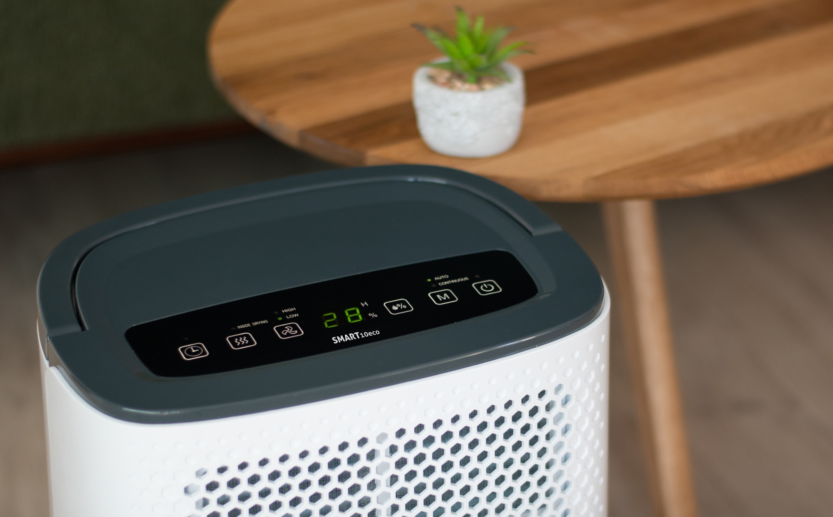 O desumidificador de condensação Turbionaire SMART 10 ECO remove até 10 litros de água por dia do ar. Este desumidificador eficiente em termos energéticos e silencioso protege edifícios e o seu conteúdo contra os efeitos prejudiciais da humidade elevada. O Turbionaire SMART 10 ECO está equipado com diversos modos: modo automático, modo de secagem contínua e Inside Drying. O seu ventilador pode ser ajustado em 2 velocidades. O Turbionaire SMART 10 ECO utiliza o refrigerante ecológico R290.