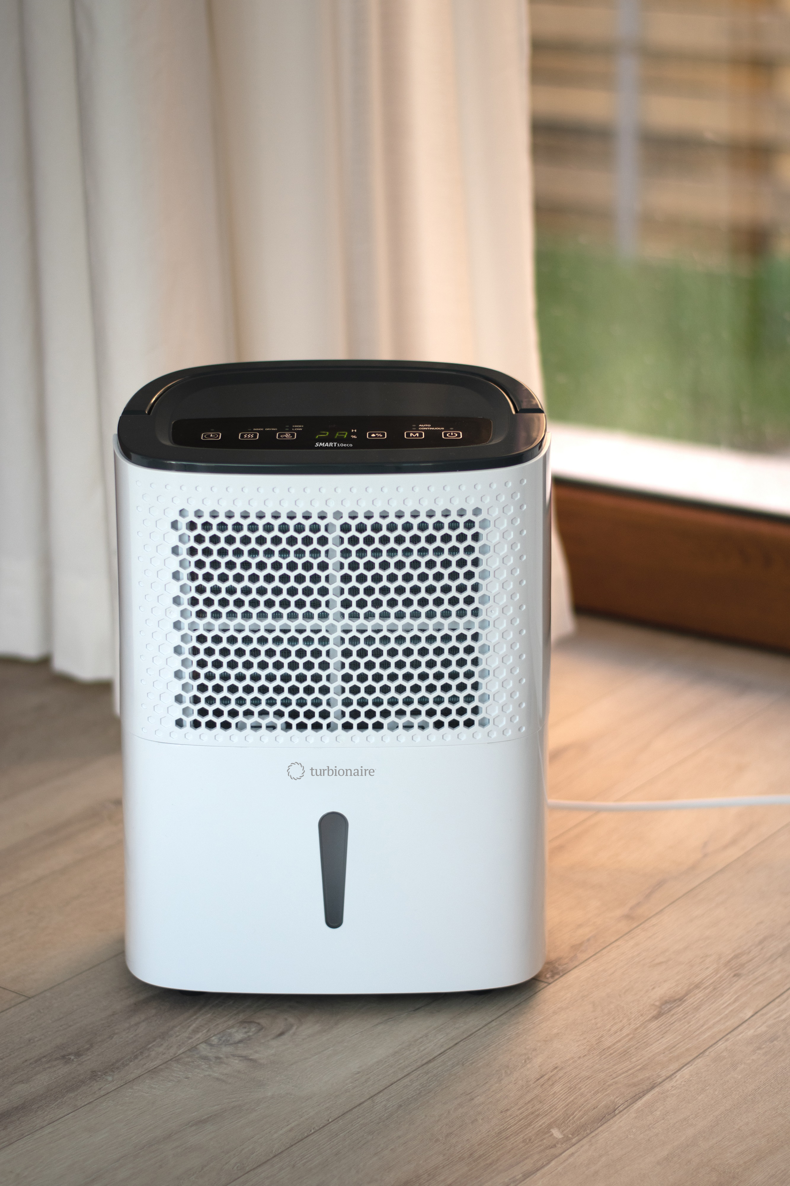 Desumidificador Turbionaire SMART 10 ECO – compacto e energeticamente eficiente O desumidificador Turbionaire SMART 10 ECO garante uma humidade saudável de forma rápida e eficaz, tanto em sua casa como no escritório. Este desumidificador por condensação compacto e silencioso tem uma capacidade de desumidificação de até 10 litros de água por dia, sendo ideal para espaços até 40 m². A operação do SMART 10 ECO é feita através de um painel digital intuitivo com tecnologia Soft-Touch, localizado na parte superior do aparelho. O painel também exibe a humidade relativa atual e definida. Pode escolher entre duas velocidades de ventilação e ajustar o sensor de humidade para o nível desejado, entre 30% e 80%. O desumidificador também oferece os modos AUTO e função de secagem de roupa. O SMART 10 ECO funciona de forma extremamente silenciosa (máx. 40 dB(A)) e é eficaz mesmo em temperaturas ambiente entre 5 ºC e 35 ºC. O condensado é recolhido num depósito de 1,8 litros, e o equipamento inclui acoplamento rápido para drenagem contínua, com mangueira incluída. O nível de água no tanque pode ser monitorado através do visor na parte frontal do aparelho. Porque controlar a humidade é importante? A humidade excessiva pode afetar a saúde, provocando alergias e problemas respiratórios, e danificar paredes, móveis, livros e pavimentos. O Turbionaire SMART 10 ECO ajuda a manter o ambiente confortável e saudável, protegendo o seu espaço e os seus bens. Características principais Ideal para áreas até 40 m² Capacidade de desumidificação: até 10 L/dia Desumidificador por compressor, com baixo custo de operação Controlo simples, com visor digital de fácil leitura 2 velocidades de ventilação Modos: AUTO, Secagem de roupa, Inside Drying Temporizador ajustável: 1 a 24 horas Filtro de ar lavável, fácil de remover e limpar Muito silencioso: até 40 dB(A) Higróstato eletrónico integrado Descongelação automática Depósito de 1,8 litros Indicador de nível de água na frente do depósito Desligamento automático com alarme quando o depósito está cheio Ligação para drenagem contínua, com mangueira incluída Reinício automático após falha de energia, mantendo as configurações Compacto e fácil de transportar, com pegas integradas e 4 pés de borracha Gás refrigerante ecológico R290